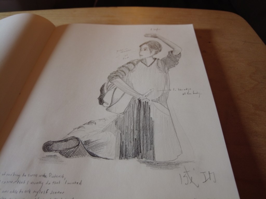 This time I went back to small series drawing (a series drawing is a set of several sketches of the same object from different angles) from David Morales’ online course, Illustrated Diary as a small do-able step to get back into drawing. I also drew for the first time, a figure drawing of a martial arts move from a young female martial artist’s video from China whose original source I cannot find to reference. I usually draw immobile figure drawings focused on shape and clothing.